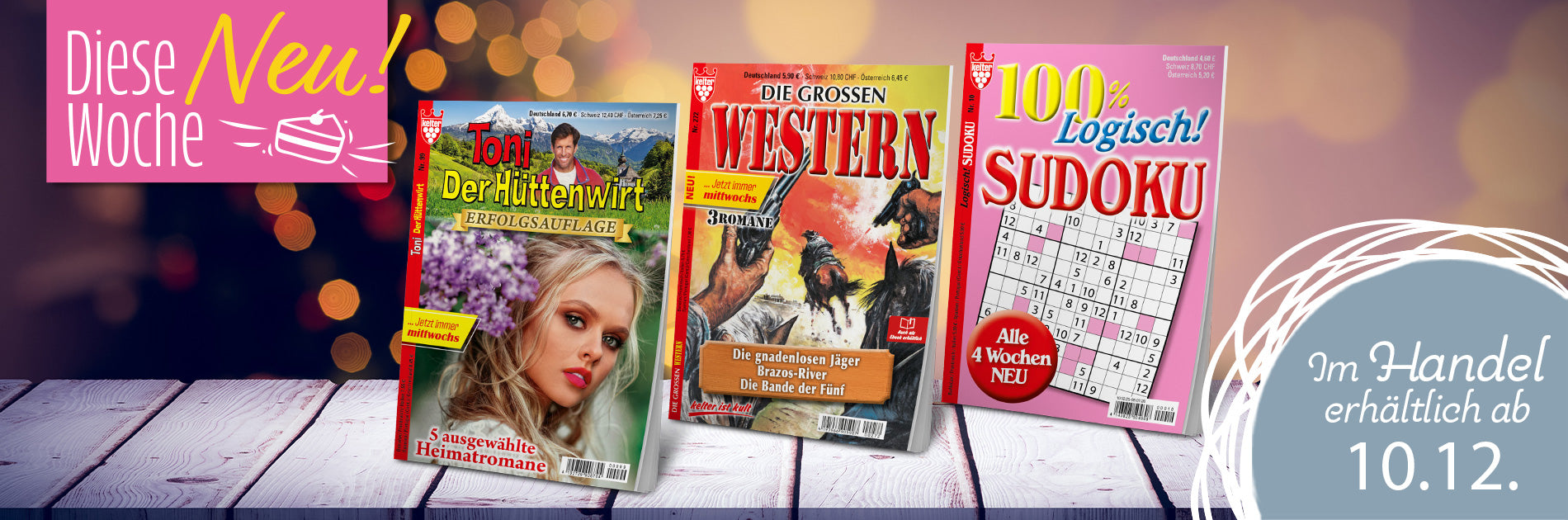 Genre Heimat: Unverzichtbar bei allen Freunden der heimatlichen Bergwelt. Das Erfolgsrezept unserer Heimatromane Der Bergpfarrer, Toni der Hüttenwirt, Heimatklänge und Heimatglocken: die richtige Mischung deftig derber und romantisch erzählter Geschichten. Genre Mystik: Gaslicht/Irrlicht - Romantic Thriller, in denen Geister, Hexen und Werwölfe munter mitmischen und für Gänsehaut sorgen. Genre Western: Der Liebesroman des Mannes war seit eh und je der Western. Die spannenden Geschichten aus der amerikanischen Pionierzeit sind wahren Ursprungs und werden von so bedeutenden Autoren wie G. F. Barner, U. H. Wilken, William Mark, Frank Laramy und vielen anderen geschrieben.